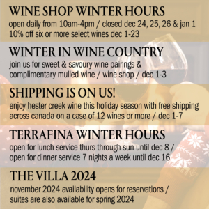 Come celebrate Winter in Wine Country with us from December 1st to 3rd where we will be offering a Sweet & Savoury wine pairing option along with complimentary mulled wine. With a shop full of gifting items, this is the perfect opportunity to do some holiday shopping while you gather with the community and experience the warmth of winter at Hester Creek.